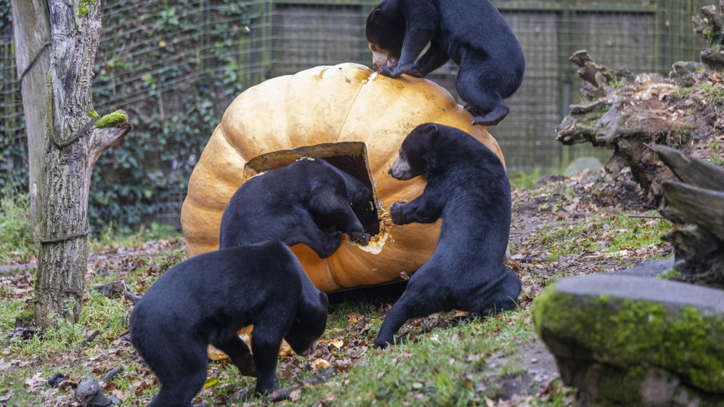 At 9 am on Friday, 19 November, a giant pumpkin weighing 635.5 kilos and a circumference of 4.65 metres surprised the five sun bears. Brasserie Staverden donated the colossal pumpkin—awarded 'the most beautiful pumpkin of the Netherlands' at the Dutch Pumpkin Growing Championship—to the inquisitive omnivores at the Arnhem Zoo.